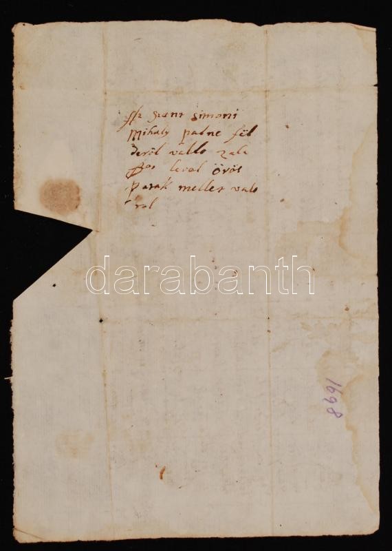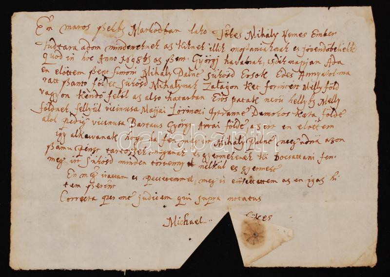 Leírás: 1698 Tőke Mihály marosszéki bíró által kiállított záloglevél, magyar nyelven, rányomott felzetes viaszpecséttel