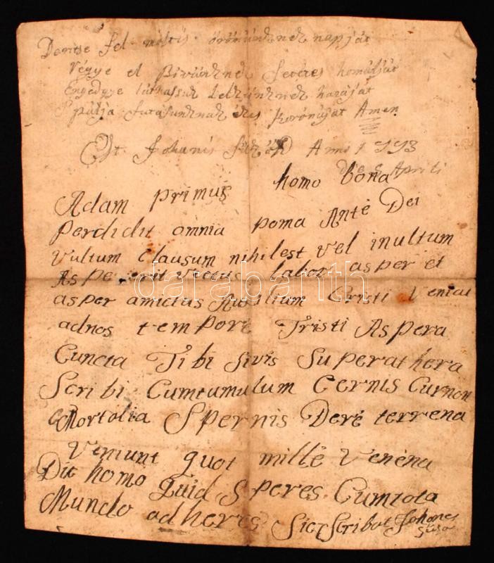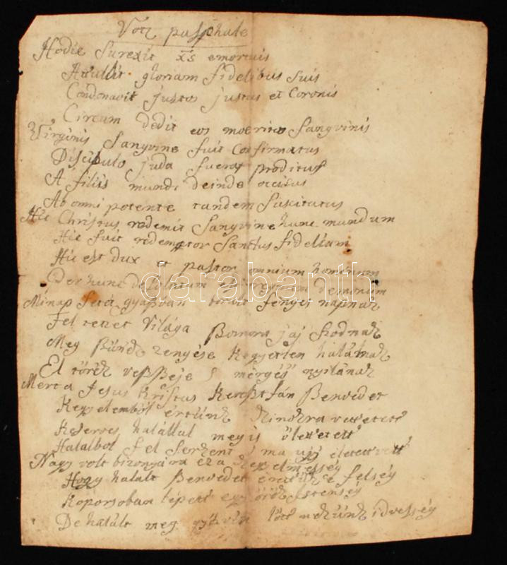 cca 1773 Latin ill. magyar nyelvű vallási témájú kéziratos vers, 2 p. https://www.darabanth.com/hu/252-Gyorsarveres/252.0/Festmeny-mutargy-papirregiseg-egyeb/Tortenelmi-dokumentumok-keziratok-erdekessegek~800031/cca-1773-Latin-ill-magyar-nyelvu-vallasi-temaju-keziratos-vers-2-p~II1221539