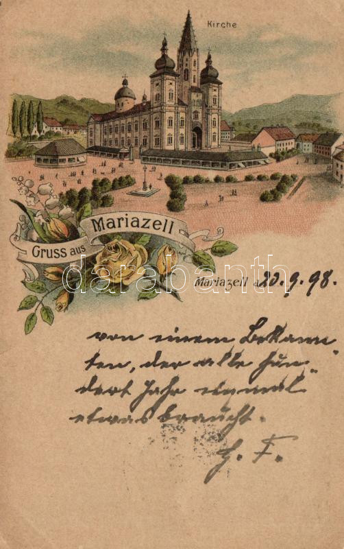 1898 Marizazell, Kirche / church, floral, litho (b) https://www.darabanth.com/hu/252-Gyorsarveres/252.0/Kepeslapok/Ausztria~200021/1898-Marizazell-Kirche-church-floral-litho-b~II1218675