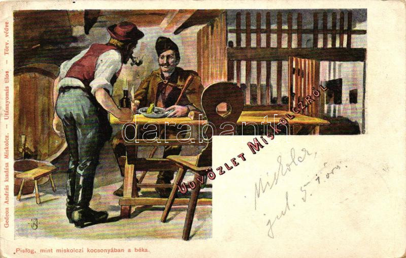 Leírás: Miskolc, Pislog mint miskolczi kocsonyában a béka, magyar folklór; Gedeon András kiadása (Rb)