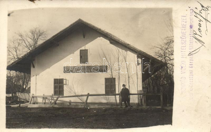 Sonkád, a Sonkád Vidéki Hitelszövetkezet és Gabonaraktár épülete az alapítóval Kocsis József lelkésszel, valamint a szövetkezet pecsétje és Kocsis aláírása, photo