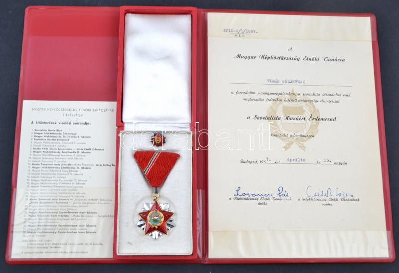 Leírás: 1967. "Szocialista Hazáért Érdemrend" zománcozott Br kitüntetés mellszalaggal és miniatűrrel dísztokban, adományozói okirattal + kitüntetések viselési sorrendje tájékoztató T:2- kopott zománcozás, rátét illesztése meglazult, javított szalag