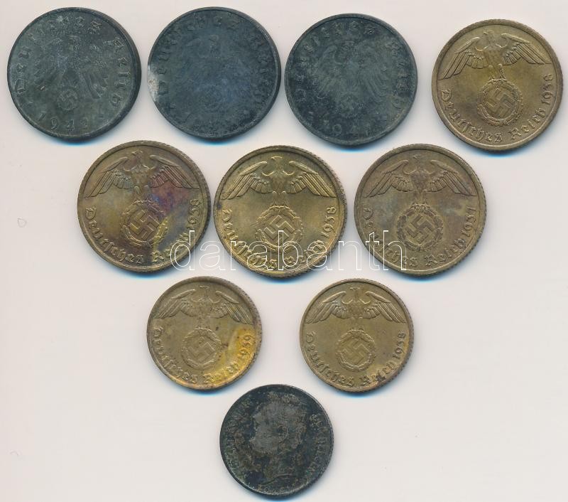 Leírás: Vegyes: Belgium 1910. 50c Ag "Albert" holland körirat + Német 3. Birodalom 1937-1942. 5pf Al-Br (2x) + 10pf Al-Br/Zn (7x) T:2,2-,3