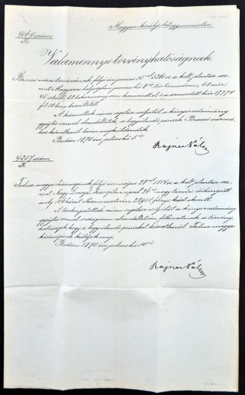 Leírás: 1870 2 db leirat Rajner Pál belügyminiszter saját kezű aláírásával