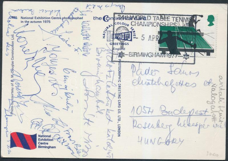 Leírás: 1975 A magyar asztalitenisz válogatott tagjai által aláírt és hazaküldött képeslap Birminghamból