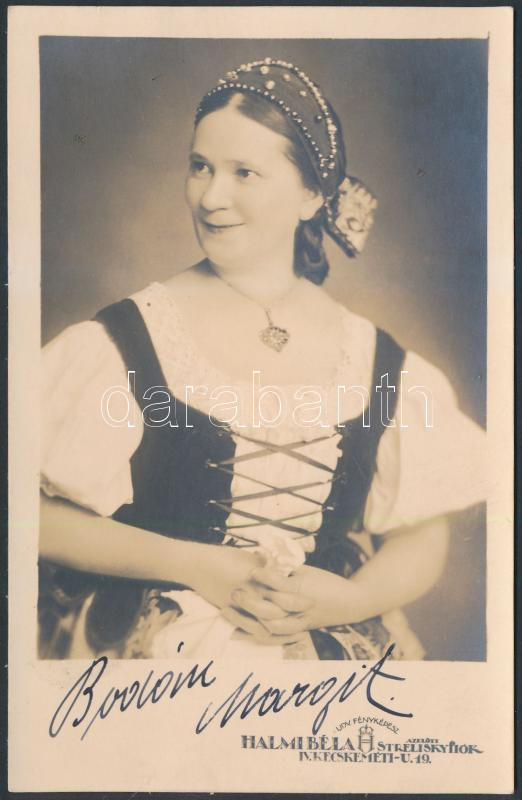 Leírás: Bodán Margit (1893-?): színésznő, dalénekesnő aláírt üdvözlő soraival ellátott fotólapja