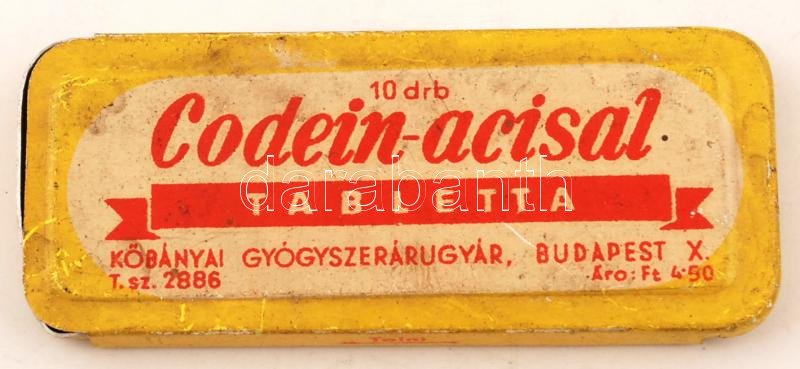Codein-acisal(Kőbányai Gyógyszerárugyár) fém gyógyszeres dobozka, 7x3x... https://www.darabanth.com/hu/253-Gyorsarveres/253.0/Festmeny-mutargy-papirregiseg-egyeb/Bolhapiac~400021/Codein-acisalKobanyai-Gyogyszerarugyar-fem-gyogyszeres-dobozka-7x3x0-5-cm~II1225368