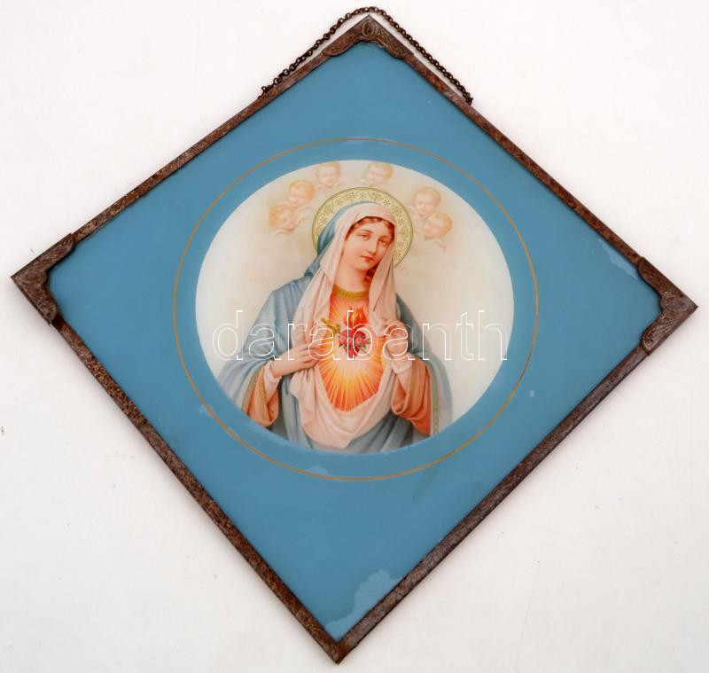 Leírás: Fém keretes üvegezett fali szentkép Szűz Máriáról, egyik sarkán hiányzó díszítéssel, 25x25 cm