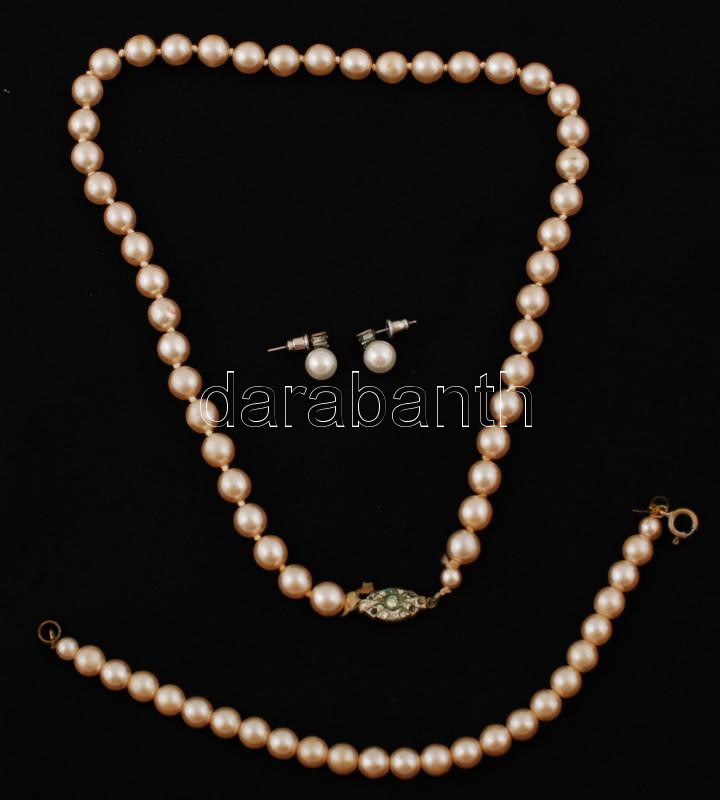 Leírás: Gyöngy nyaklánc hozzáillő gyöngy karkötővel, h: 17 és 41 cm, 1 pár fülbevalóval