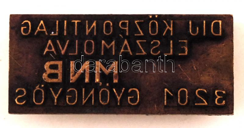 Leírás: Réz pecsétnyomó: Díj központilag elszámolva, MNB, Gyöngyös, 4x2cm