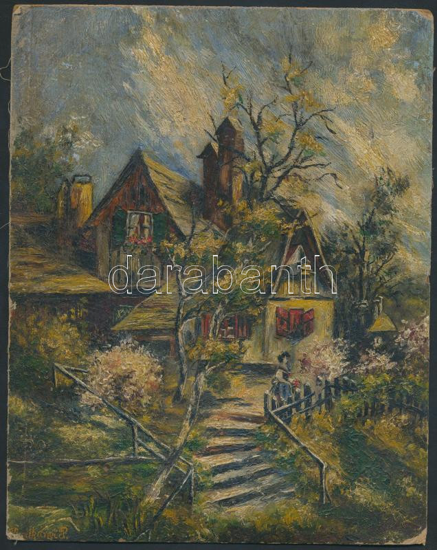 Leírás: Olvashatatlan jelzéssel: Vidéki idill, olaj, farost, 24x19cm