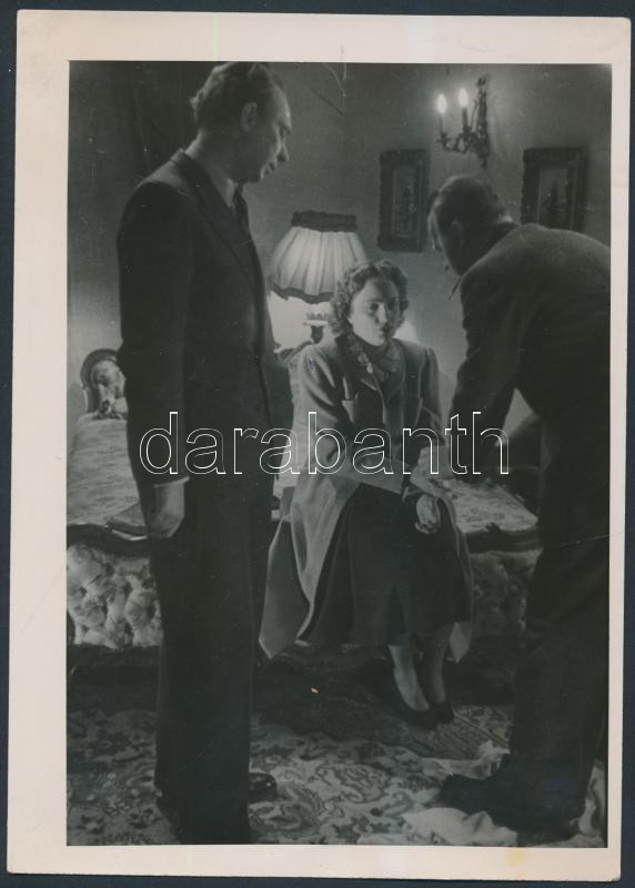 Leírás: cca 1940 Cserépy rendezői utasítást ad Bulla Elma színésznőnek a felvétel előtt, balról Tímár József látható, 18x13 cm