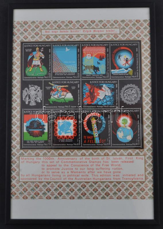 Leírás: 1969 ausztráliai erdélyi magyarok által kiadott emlékív Szent István születésének 1000. évfordulójára, bekeretezve
