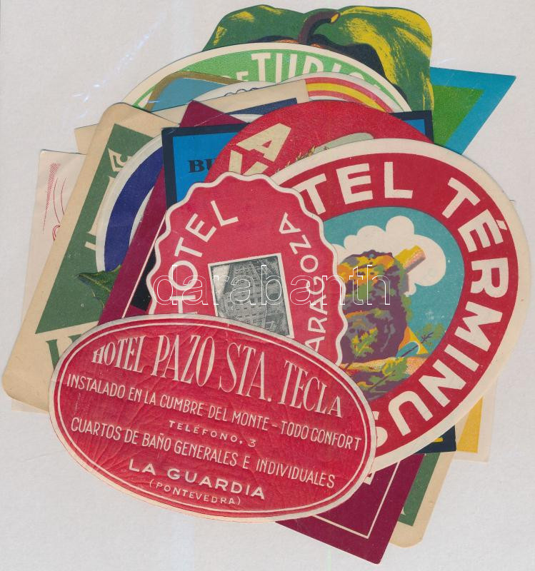 Leírás: Spanyol és portugál bőröndcímkék(Hotel Pazo Sta. Tecla, Hotel Brostol Barcelona, Hotel Valencia, stb.), 22 db / luggage labels