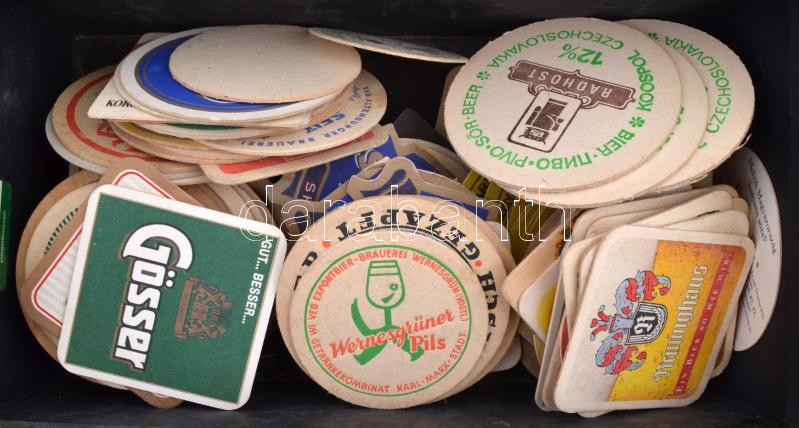 Leírás: cca 1980 Különböző külföldi és magyar söralátétek, vegyes méretben és minőségben, egy cipős doboznyi