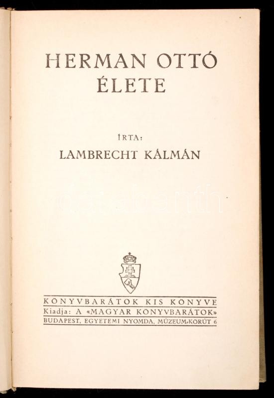 Lambrecht Kálmán: Herman Ottó élete. Bp., 1933., Egyetemi ny. 264 p. Számos szövegközti rajzzal illusztrálva. Kiadói kissé foltos egészvászon-kötésben.