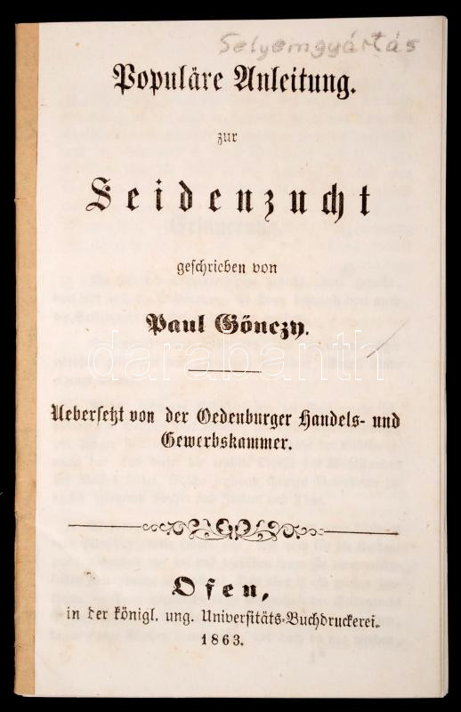 Gönczy Pál: Populäre Anleitung zur Seidenzucht. Ofen, 1863. Univ. Köny... https://www.darabanth.com/hu/253-Gyorsarveres/253.0/Konyvek-terkepek-nyomtatvanyok/Konyvek-Konyha-es-kert~400018/Gonczy-Pal-Populare-Anleitung-zur-Seidenzucht-Ofen-1863-Univ-Konyv-a-selyemkeszitesrol-~II1231015