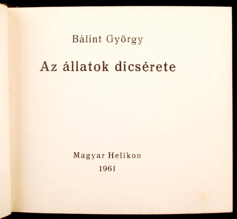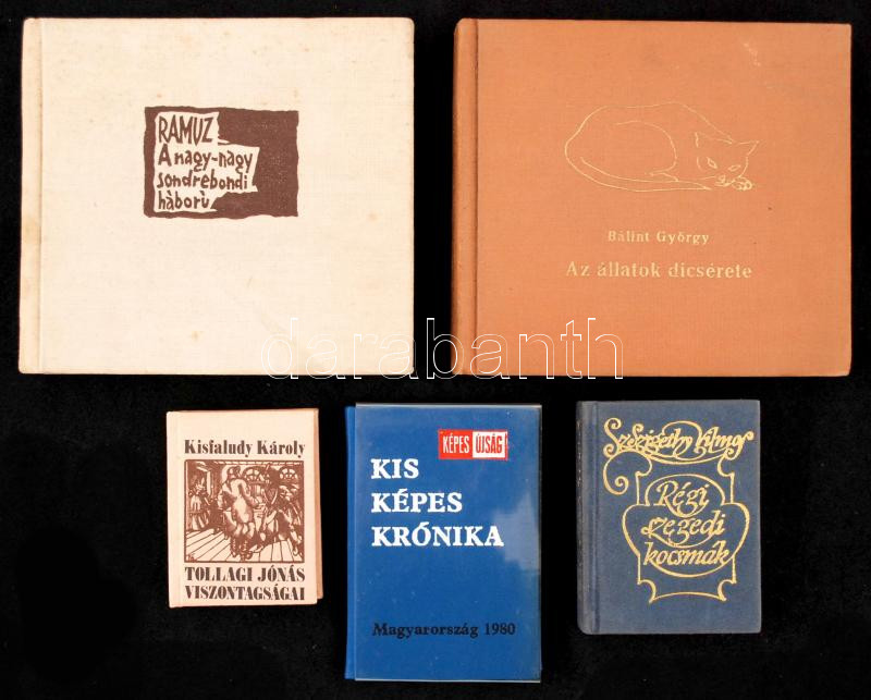 5 db minikönyv: Sz. Szigethy Vilmos: Régi szegedi kocsmák (Szeged, 1988); Kisfaludy Károly: Tollagi Jónás viszontagságai (h. n., 1986, Kner; készült 400 példányban); Kis Képes Krónika ([Bp.], 1980); Bálint György: Az állatok dicsérete (h. n. 1961, Magyar Helikon); Ramuz, C. F.: A nagy-nagy sonderbondi háború (h. n., 1960, Magyar Helikon). Példányonként változó, nagyrészt jó állapotban.