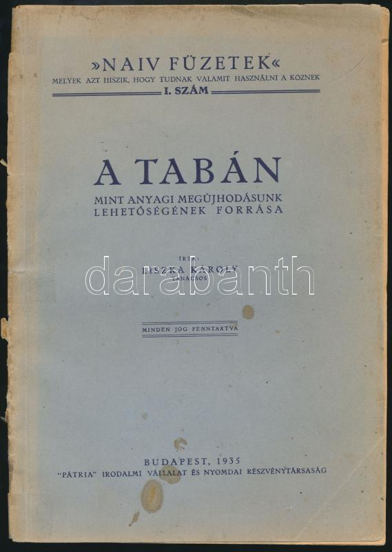 Liszka Károly: A Tabán, mint anyagi megújhodásunk lehetőségének forrása. Bp., 1935, Pátria Irodalmi Vállalat és Nyomdai Rt. Kopott, sérült gerincű papírkötésben, egyébként jó állapotban.