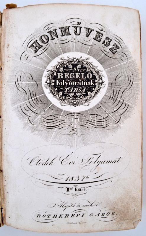 1837 Honművész, a Regélő folyóiratnak társa, II. kötet, V. évfolyam 53-104. szám könyvbe kötve, színezett lapszélekkel, alapító és szerkesztő: Róthkrepf Gábor, Trattner-Károlyi Nyomda