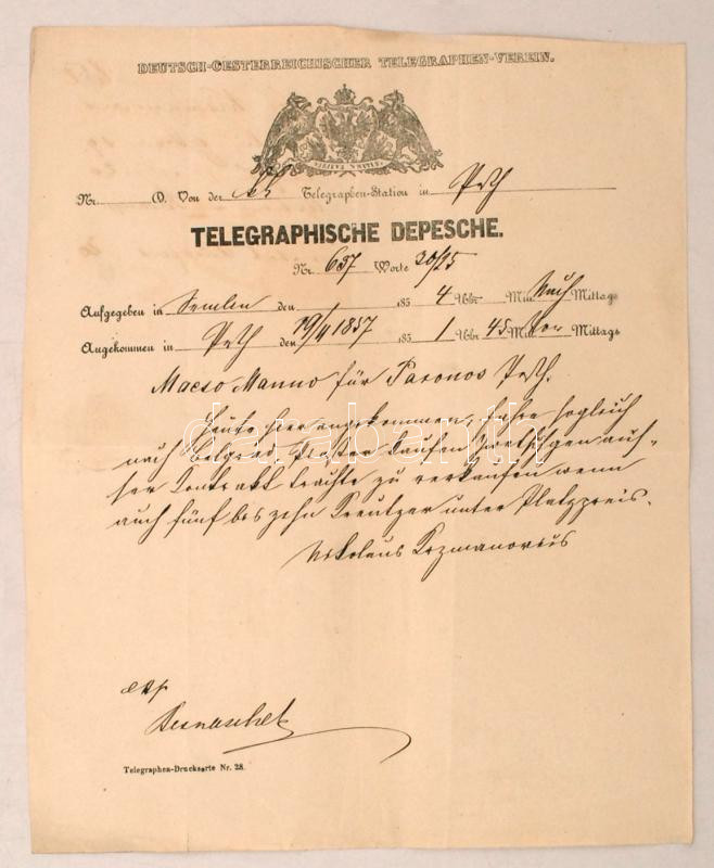 1857 Telegraphische Depesche, Német-Osztrák távirat díszes fejléces pa... https://www.darabanth.com/hu/253-Gyorsarveres/253.0/Konyvek-terkepek-nyomtatvanyok/Nyomtatvanyok~400042/1857-Telegraphische-Depesche-Nemet-Osztrak-tavirat-diszes-fejleces-papir-27x22cm~II1224512