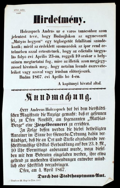 Leírás: 1867 Hirdetmény: Budaujlakon, "Mátyás hegyen", téglaégetőt szándékoznak felállítani, A kapitányi Hivatal által, 38x23cm