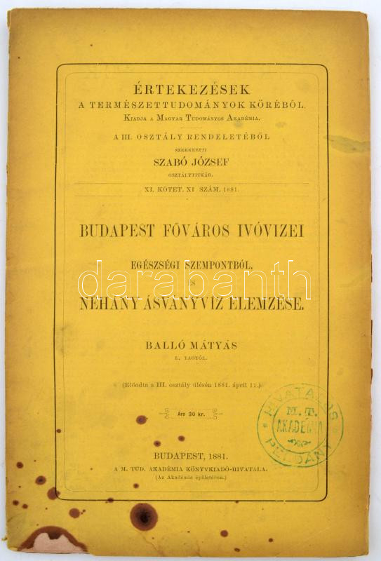 1881 Balló Mátyás: Budapest főváros vizei egészségi szempontból, és néhány ásványvíz elemzése. Értekezések a természettudományok köréből. Magyar Tudományos akadémia, szöveget nem érintő kis hibával, pp.:53, 24x16cm