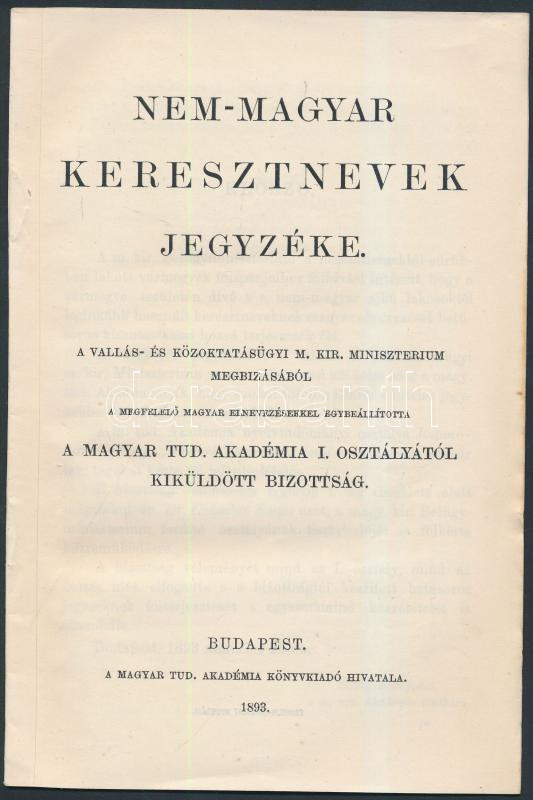 1893 A nem magyar keresztnevek jegyzéke. 20p. https://www.darabanth.com/hu/253-Gyorsarveres/253.0/Konyvek-terkepek-nyomtatvanyok/Nyomtatvanyok~400042/1893-A-nem-magyar-keresztnevek-jegyzeke-20p~II1231003
