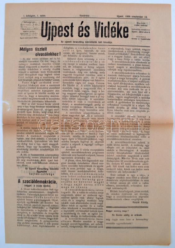 Leírás: 1909 Az Ujpest és Vidéke, az újpesti keresztény szocialisták heti híradója 1. évfolyamának 1. száma
