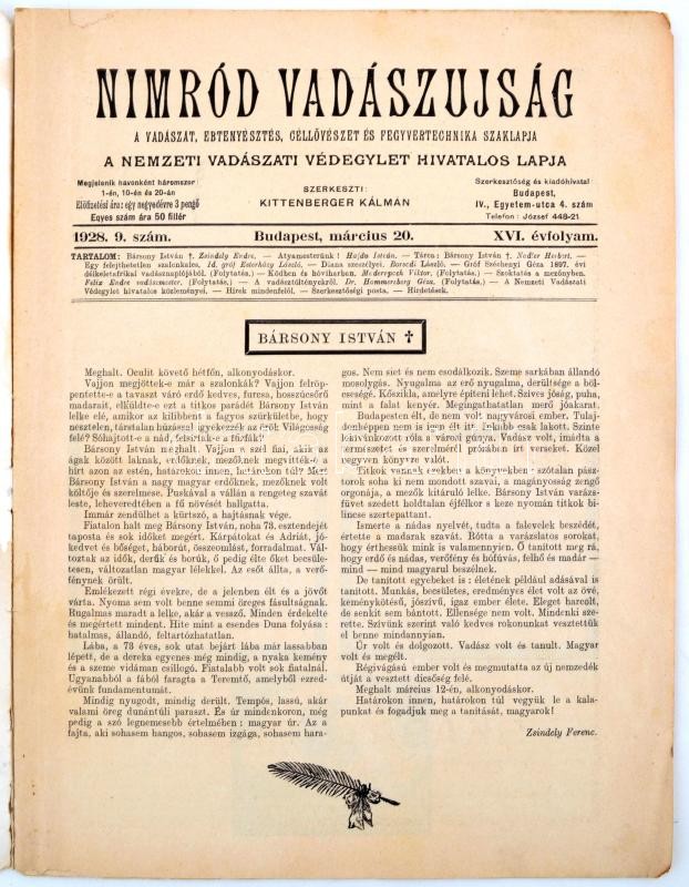 1928 Nimród vadászújság, a Nemzeti Vadászati Védegylet hivatalos lapja... https://www.darabanth.com/hu/253-Gyorsarveres/253.0/Konyvek-terkepek-nyomtatvanyok/Nyomtatvanyok~400042/1928-Nimrod-vadaszujsag-a-Nemzeti-Vadaszati-Vedegylet-hivatalos-lapja-16-evf-9-sz-sok-C3~II1229259