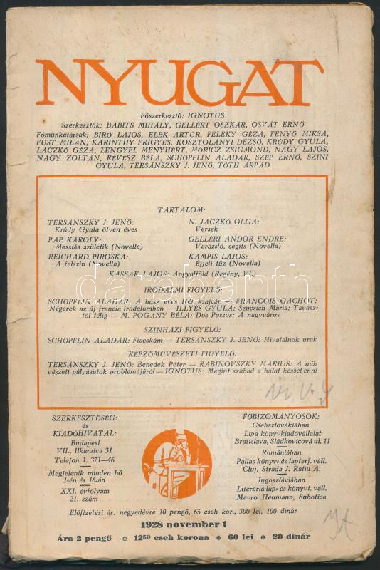 Leírás: 1929 A Nyugat című folyóirat XXI. évfolyamának 21. száma, benne Gelléri Andor Endre, Tersánszky Jenő, Schöpflin Aladár és mások írásaival