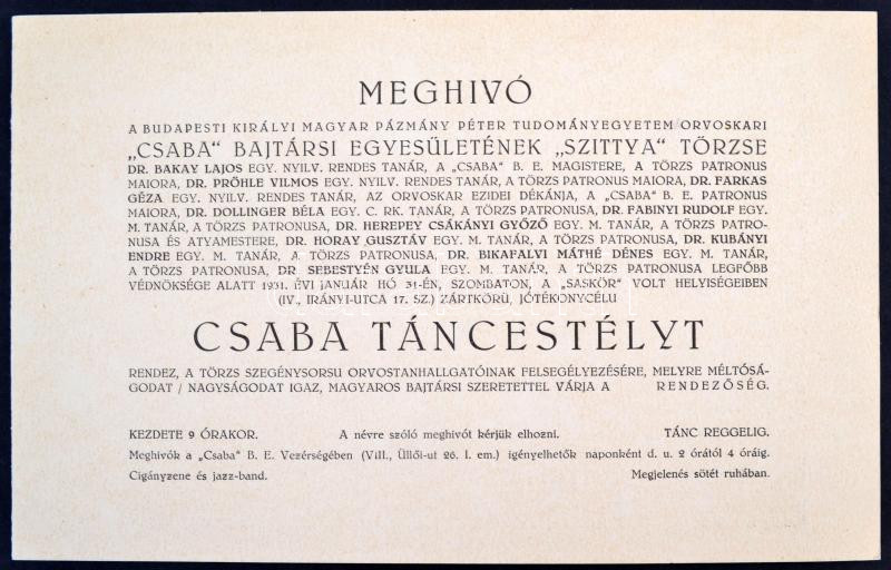 Leírás: 1931 Orvoskar Csaba bajtársi Egyesületének Szittya törzse meghívója táncestélyre 23x14 cm