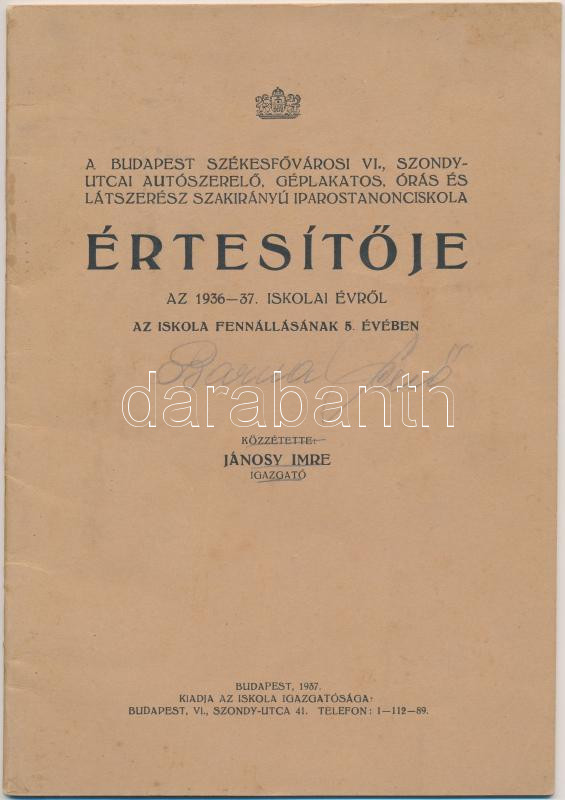 1937 A Budapest SzékesfÅ‘városi VI., Szondy-utcai auószerelÅ‘, géplakatos, órás és látszerész szakirányú iparostanonciskola érstesÃtÅ‘je az 1936-37. iskolai évrÅ‘l az iskola fennállásának 5. évében. pp.:32, 24x17cm