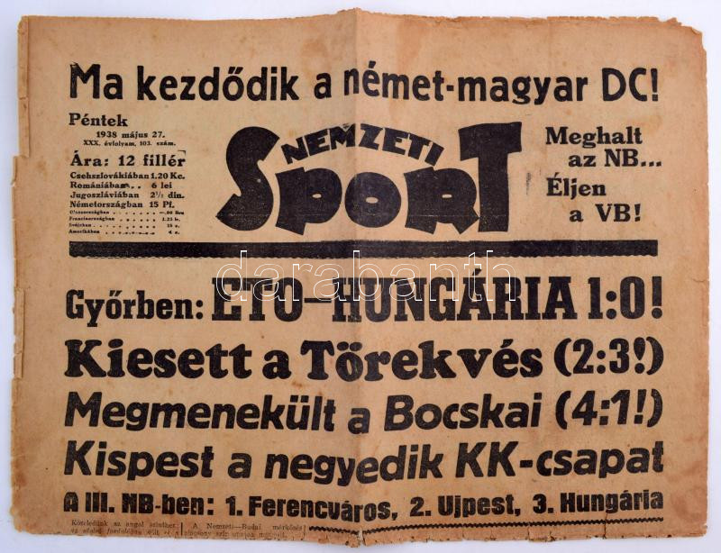 1938 a Nemzeti Sport 30. évf. 103. lapszáma érdekes aktuális hírekkel,... https://www.darabanth.com/hu/253-Gyorsarveres/253.0/Konyvek-terkepek-nyomtatvanyok/Nyomtatvanyok~400042/1938-a-Nemzeti-Sport-30-evf-103-lapszama-erdekes-aktualis-hirekkel-hianyos~II1229510