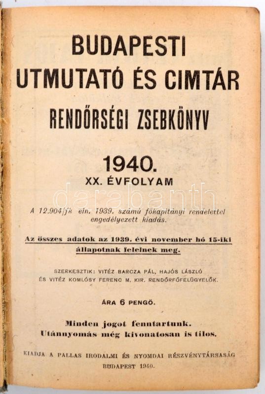 1940 Budapesti Útmutató és Címtár XX. évfolyam, rendőrségi zsebkönyv, ... https://www.darabanth.com/hu/253-Gyorsarveres/253.0/Konyvek-terkepek-nyomtatvanyok/Nyomtatvanyok~400042/1940-Budapesti-Utmutato-es-Cimtar-XX-evfolyam-rendorsegi-zsebkonyv-496p~II1230751