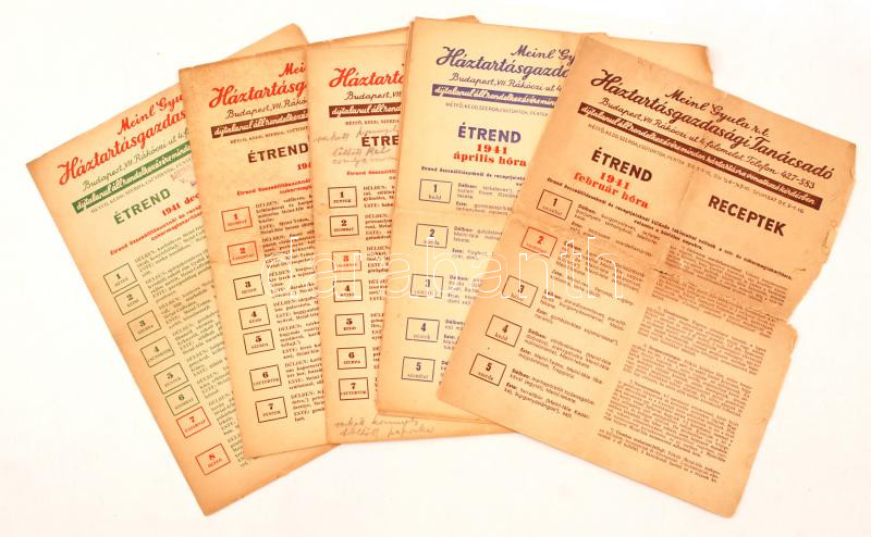 1941 A Meinl Gyula R.T. Háztartásgazdasági Tanácsadójának 6 db étrendj... https://www.darabanth.com/hu/253-Gyorsarveres/253.0/Konyvek-terkepek-nyomtatvanyok/Nyomtatvanyok~400042/1941-A-Meinl-Gyula-RT-Haztartasgazdasagi-Tanacsadojanak-6-db-etrendje-receptekkel~II1228008
