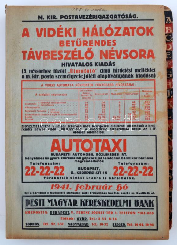 Leírás: 1941 A vidéki hálózatok betűrendes távbeszélő névsora, kiadja a M.Kir.Postavezérigazgatóság