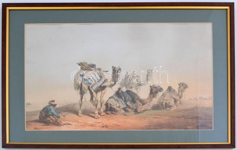 Forray Iván (1817-1852): Tevék hajcsárral, nagyméretű litográfia az Utazási album (Pest, 1859) című posztumusz megjelent munkájából, jelzés nélkül, paszpartuban, üvegezett fa keretben, 28×42 cm