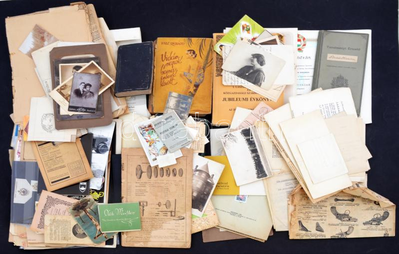 Leírás: Nagy, átnézni való papírrégiség tétel, benne nyomtatványok, okmányok, egy két könyv