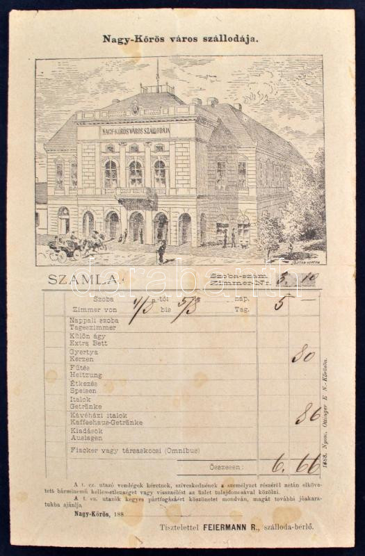 Leírás: cca 1880 Nagykőrös városi szálloda grafikus számla