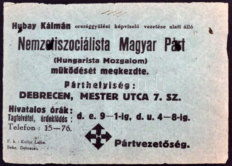Leírás: cca 1930 Debrecen Nemzeti Szocialista Magyar Párt röplapja iroda nyitásról