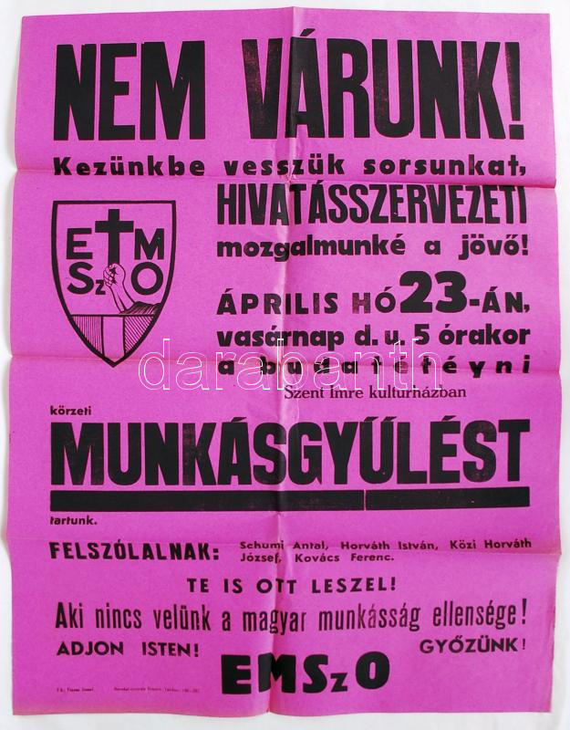 cca 1930 EMSZO Egyházközségi Munkásszakosztály plakát 50x70 cm https://www.darabanth.com/hu/253-Gyorsarveres/253.0/Konyvek-terkepek-nyomtatvanyok/Nyomtatvanyok~400042/cca-1930-EMSZO-Egyhazkozsegi-Munkasszakosztaly-plakat-50x70-cm~II605788