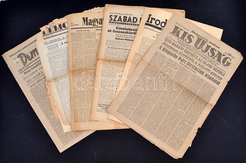 Leírás: cca 1945-50 Különböző napilapok (Demokrácia, Magyar Nemzet, Szabad Nép, Kis Újság, Irodalmi Újság), 7db, kissé viseltes állapotban