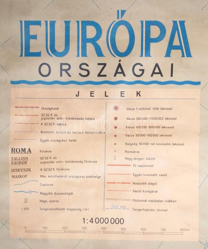 Leírás: 1965 Európa országai, iskolai vászontérkép, kiadja az Állami Földmérési és Térképészeti Hivatal Kartográfiai Vállalata, 125x188 cm