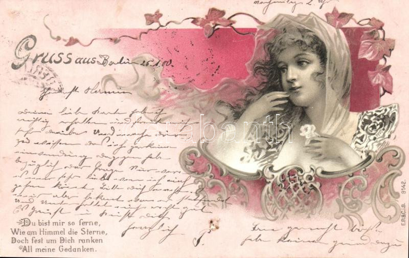 Leírás: Lady, floral, Art Nouveau, E.B. & Ci.B. 9142. litho