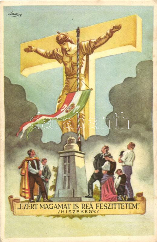 Leírás: 'Ezért magamat is reá feszíttetem', Hiszekegy, kiadja az Ereklyés Országzászló Nagybizottsága / Hungarian irredenta, s: Lamos (EK)