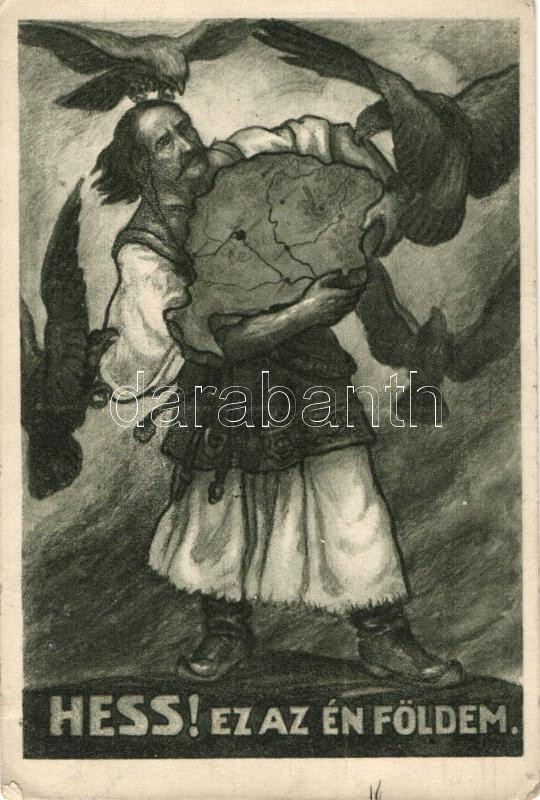 Hess! Ez az én földem; kiadja a Szózat, Magyarország Területi Épségének Védelmi Ligája napilapja / Hungarian irredenta, Trianon map s: Helbing Aranka (EK)