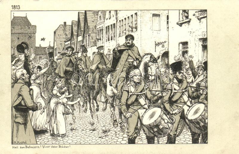 Leírás: 1813 Heil den Befreiern! Vivat Vater Blücher!, Die eiserne Zeit vor hundert Jahren 1806-1813 / Military art postcard s: Richard Knötel