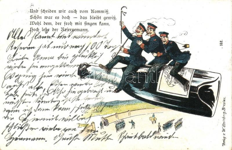 Leírás: WWI German soldiers riding a glass of champgane, humour, litho