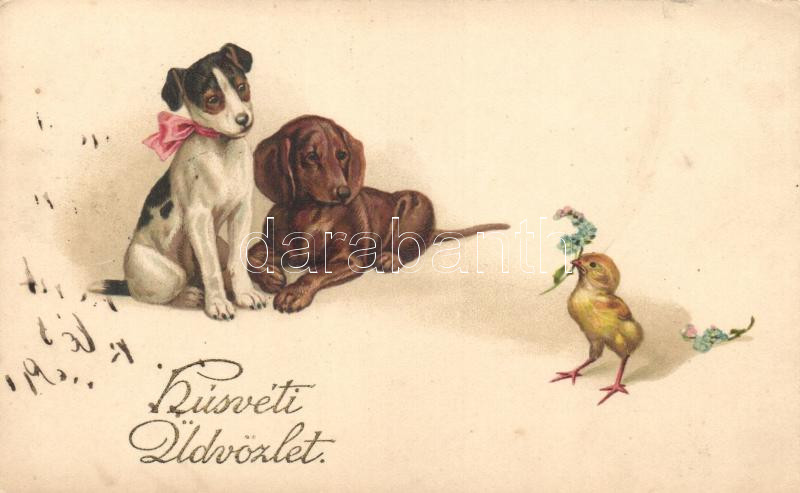 Leírás: Easter, dogs, chicken, Amag Nr. 1587. litho (small tear)